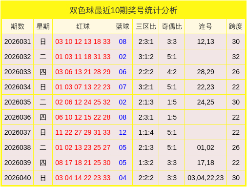 上期开奖数据中得知三区比为2:2:2,奇偶比为3:3,开出2组连号03,04,22,23,跨度数据为30。